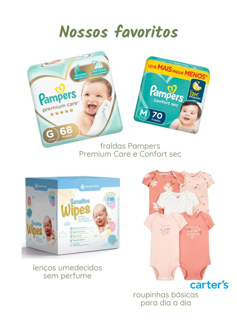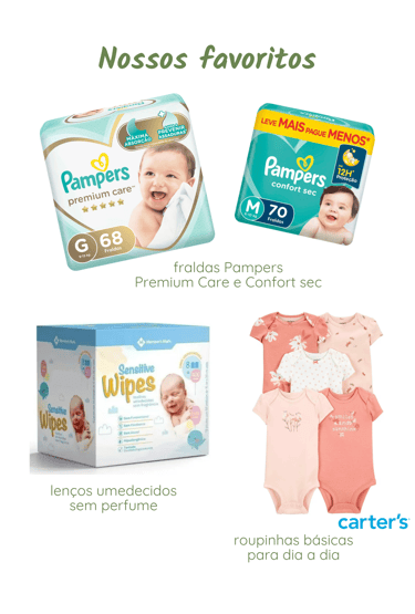 Fraldas e lenços umedecidos são sempre necessários, ao lado colocamos nossos favoritos.